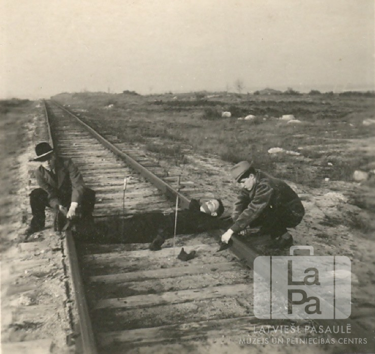 Trīs jaunieši no Dilingenes nometnes (amerikāņu zonā) pie dzelzceļa sliedēm. Divi puiši cepurēs sien trešo puisi pie sliedēm. Fonā klajš, nelīdzens lauks ar tālumā redzamiem pāris kokiem. Kreisajā pusē sliedes aizstiepjas taisnā līnijā tālumā. Foto autors: Genis Zelčs.
