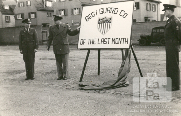 Trīs vīri formastērpos stāv laukumā pie plakāta ar uzrakstu "BEST GUARD CO / OF THE LAST MONTH" Cufenhauzenā (amerikāņu zonā). Aizmugurē, labajā pusē, pie augstas ķieģeļu sienas novietota automašīna. Aiz sienas redzamas vairākstāvu dzīvojamās ēkas.