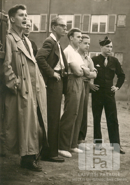 Seši jauni vīrieši stāv rindā Ludvigsburgā (amerikāņu zonā). Vienam vīrietim mugurā gaišs mētelis, cits vīrs ir ģērbies uzvalkā ar fotoaparātu kaklā, vēl cits ir ģērbies tumšā formastērpā. Fonā mūra ēka. Pirmais no kreisās: Genis Zelčs. Foto autors: Genis Zelčs.