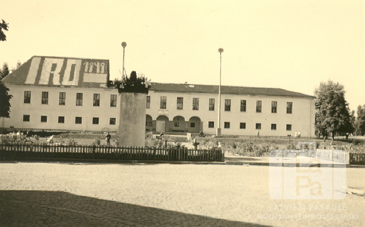 Gara divstāvu mūra ēka Memmingenē (amerikāņu zonā). Kreisajā pusē uz jumta ir liels uzraksts: "IRO 1949". Priekšplānā ir bruģēts laukums, aiz kura ir žogs, augsts monuments un apstādījumi. Monumentam kreisajā pusē ir redzams vīrietis. Foto autors: Genis Zelčs.