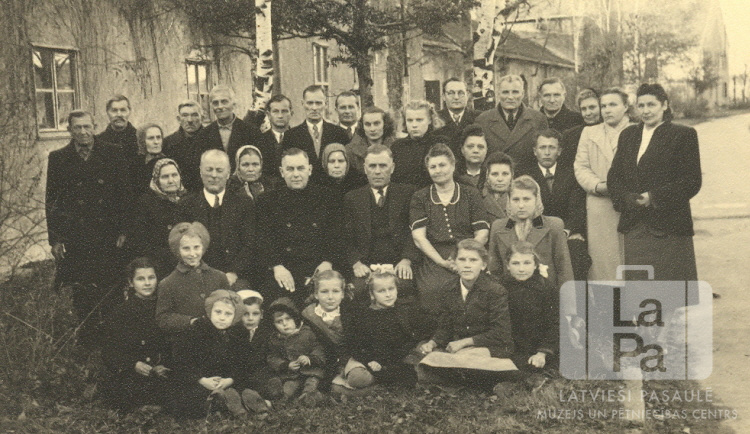 Cilvēku grupa no Memmingenes Katoļu draudzes pie mūra ēkas Memmingenē (amerikāņu zonā). Lielākā daļa grupas ir ģērbusies mēteļos. Aiz grupas ir trīs koki. Blakus, labajā pusē, iela un tālumā ēkas. Otrajā rindā, trešā no kreisās: Zofija Zelčs. Trešajā rindā, septītais no kreisās: Vincents Zelčs.
