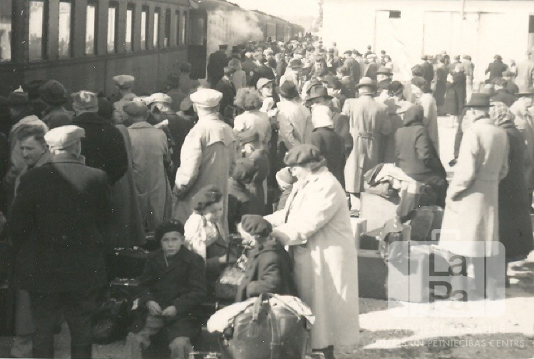 Cilvēku pūlis Memmingenes stacijā (amerikāņu zonā) pie vilciena. Cilvēki ģērbušies mēteļos, starp cilvēkiem uz zemes ir mantas un koferi. Cilvēku pūlis aizstiepjas tālumā pa stacijas peronu. Priekšplānā, labajā pusē, pie koferiem stāv: pirmā Zofija Zelčs (tumšā mētelī, ar rūtainu lakatu galvā), otrais Vincents Zelčs (gaišā mētelī, ar tumšu cepuri). Foto autors: Genis Zelčs. Par šo gadījumu Genis Zelčs atceras: "Šeit visādu tautību cilvēki gaida vilcienu uz Bremerhāfeni. Visi dokumenti bija nokārtoti, un fiziskā pārbaude izieta. Dienu no dienas bija jāstāv rindā visādās vietās un birojos tajā emigrācijas centrā. Es zvērēju, ka mainīšu savu uzvārdu uz Abamu, lai visur būtu pirmais alfabētā. Beidzamā vieta bija Minhenes ASV konsulāta priekšā, kur uzspieda beidzamo zīmogu."