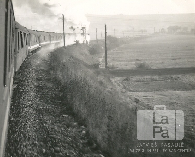 Skats no vilciena ceļā no Memmingenes nometnes (angļu zonā) uz Brēmerhāfeni. Vilciens griežas līkumā. Tā priekšā lokomatīvi ietver liels gaišu dūmu mākonis. Dzelzceļa sliežu labajā malā ir elektrības līnija un lauki. Dzelzceļa sliežu kreisajā pusē tālumā ir redzama nogāze. Foto autors: Genis Zelčs. Par šo gadījumu Genis Zelčs atceras: "Pēdējais brauciens Vācijā. Kad mēs tikām Bremerhāfenē, mēs tur padzīvojām kādu pusotru nedēļu kādā internacionālā nometnē. Mūs pielika pie darba, kā, piemēram, man bija jāpasniedz angļu valodas stundas tiem, kuriem nebija nekādas angļu valodas zināšanas. Tur vairs nebija latvietis ar latvieti, bet visādas tautības kopā. Kad atbrīvosies kuģis, kurš bija atvedis kareivjus uz Vāciju, visas mocības pa Vāciju būs cauri. Par mūsu ģimenes transportu Katoļu Organizācija solījās samaksāt. Mēs parakstījām, ka mēs to atmaksāsim, bet līdz šim laikam neviens to nav prasījis."