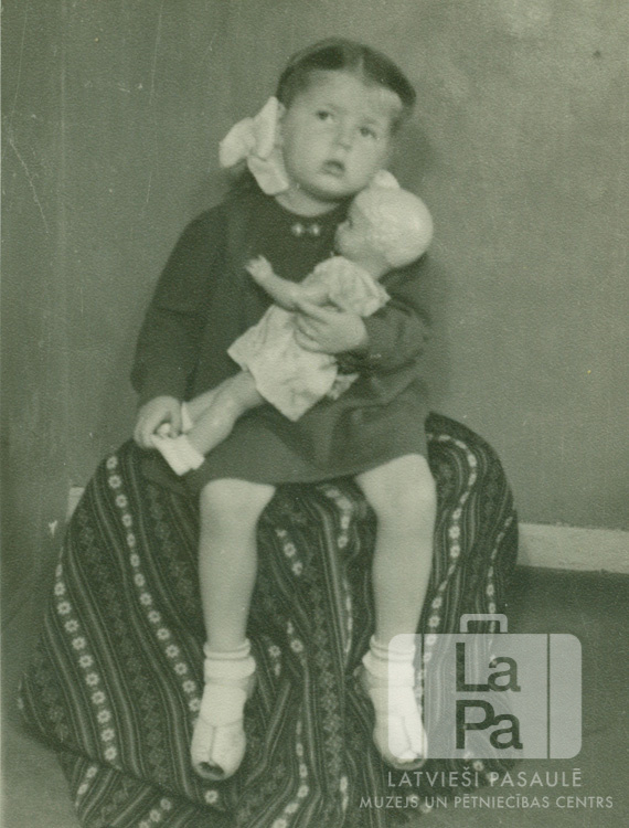 Liene Blūms bērnībā sēž ar lelli rokās Eslingenē (amerikāņu zonā) uz sola, kas pārklāts ar tautastērpa svārkiem.