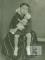 Meitene sēž ar lelli rokās. Sols pārklāts ar tautisku segu vai tautastērpa brunčiem.
