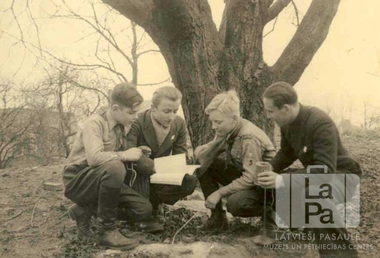 Četri skauti no Saules nometnes Gēsthahtā (angļu zonā) formastērpos pēta grāmatu skautu kursu laikā no 1945. gada 27. līdz 30. decembrim. Vienam puisim rokās ir auklā pakārts akmens. Fonā liels koks, aizmugurē mežs. No kreisās: Edgars Šupstiks, Uldis Gelēvics, Ivars Gūtmanis un Edvīns Nātre. Par šo gadījumu Gunārs Āboliņš atceras: "Ieraksts Kaiju kopa dienas grāmatā: Vilku mēneša pēdējās dienās notika skautu kopnieku kursi. No Pērses 5. sk. vienības Kaiju kopa piedalījās četri skauti. Kursus vadīja vadītājs Mārtiņš Vētra. Kursos piedalījās skauti no Altgarges, Bernsenes un Špakenbergas DP nometnēm. Acis darba izbijās, Rokas darba nebijās, Rokas darba nebijās – Zinājās padaram."