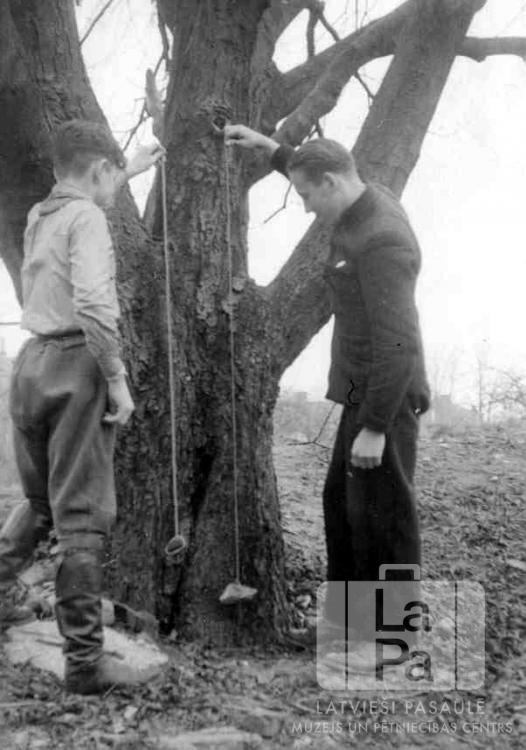 Divi skauti no Saules nometnes Gēsthahtā (angļu zonā) formastērpos pie liela koka tur auklā pakārtus akmeņus skautu kursu laikā no 1945. gada 27. līdz 30. decembrim. No kreisās: Edgars Šupstiks, Edvīns Nātre.