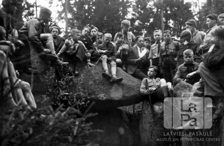 Skautu grupa formastērpos mežā sirojuma laikā uz kapiem Altgargē (angļu zonā), brīdi pēc sīvas āra rotaļas. Sirojums notika 1946. gada 25.–26. aprīlī. Grupā ir zēni gan no Pērses 5. un Abavas 6. vienības no Saules nometnes Gēsthahtā, gan, iespējams, Airītes 82. un Sidrabenes 33. skautu vienības no Altgarges nometnes. Daļa skautu sēž uz lieliem akmeņiem.