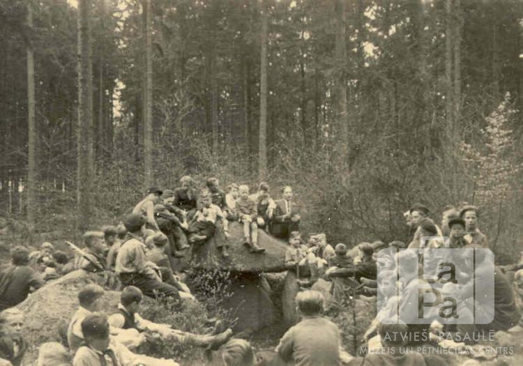 Liela skautu grupa formastērpos sēž mežā sirojuma laikā uz kapiem Altgargē (angļu zonā), brīdi pēc sīvas āra rotaļas. Sirojums notika 1946. gada 25.–26. aprīlī. Grupā ir zēni gan no Pērses 5. un Abavas 6. vienības no Saules nometnes Gēsthahtā, gan, iespējams, Airītes 82. un Sidrabenes 33. skautu vienības no Altgarges nometnes. Daļa skautu sēž uz lieliem akmeņiem.