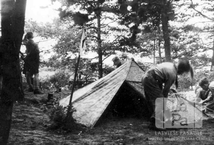 Skauts formastērpā no Saules nometnes Gēsthahtā (angļu zonā) mežā pie telts ieejas nometnes iekārtošanas laikā. Aizmugurē redzami vēl vairāki zēni.