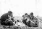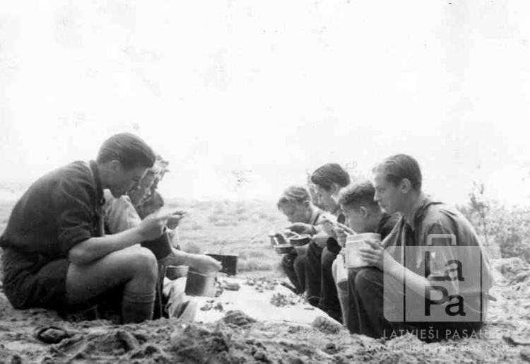Skauti no Saules nometnes Gēsthahtā (angļu zonā) formastērpos sēž uz zemes un ēd no metāla traukiem pie pašu darināta zemes galda, kuram abās pusēs ir izraktas bedres kāju novietošanai. Pašdarinātais zemes galds ir pārklāts ar galdautu. Fonā pļavas ainava. Par šo gadījumu Gunārs Āboliņš atceras: "Ieraksts Kaiju kopa dienas grāmatā: Pirmā nometne Lapu mēneša 30. dienā. Saulei lecot, visi Pērses 5. skauti bija sapulcējušies pie mītnes ar mugursomām plecos, jo ir paredzēts iziet vienas dienas nometnē, augstā Elbas krasta kraujā.