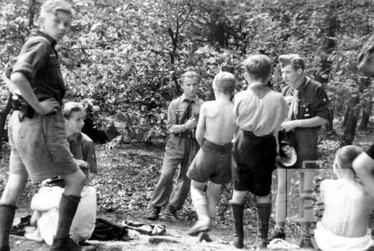Skauti no Saules nometnes Gēsthahtā (angļu zonā) formastērpos mežā. Divi zēni ir tikai šortos. Par šo gadījumu Gunārs Āboliņš atceras: "Ieraksts Kaiju kopa dienas grāmatā: Pirmā nometne Lapu mēneša 30. dienā. Saulei lecot visi Pērses 5. skauti bija sapulcējušies pie mītnes ar mugursomām plecos, jo ir paredzēts iziet vienas dienas nometnē, augstā Elbas krasta kraujā."