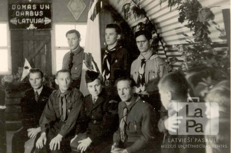 Sēž grupa vīrieši formas tērpos. Aizmugurē karogs ar karoga sardzi skautu formās.