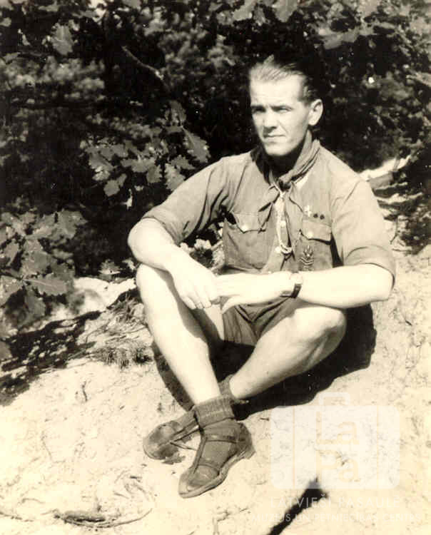 Saules novada roveru cilts virsaitis, vadītājs Valdis Saksons sēž uz akmens Saules nometnē Gēsthahtā (angļu zonā). Fonā ozola lapas.