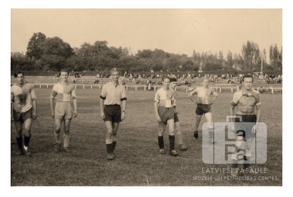 Septiņi vīrieši no latviešu tehnikuma futbola komandas sporta tērpos uz laukuma Fērdenes nometnē (angļu zonā). Fonā, otrpus laukumam, redzamas tribīnes ar skatītājiem. No kreisās: I. Mancs, ? Dicmanis, G. Čukurs, G. Linde, A. Linde, ? Koritovskis. Par šo gadījumu Gunārs Čukurs atceras: "Daļa no tehnikuma futbola komandas pēc spēles atstāj laukumu."