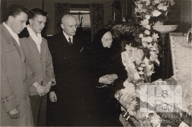 Četri cilvēki – divi puiši, vīrietis un sieviete – stāv pie vaļēja zārka Gēsthahtas kapličā (angļu zonā). Zārks ir rotāts ar ziediem. No kreisās: Juris Karnītis, Kārlis Karnītis, Kārlis Karnītis un Kristīne Karnīte.