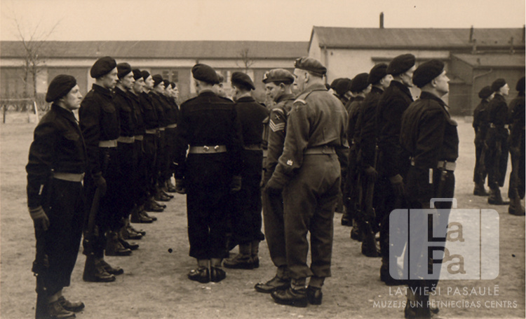 Latviešu sardzes rotas vīrieši tumšos formastērpos un ar cepurēm galvās militārās inspekcijas laikā stāv vairākās rindās laukumā Oldenburgā (angļu zonā). Fonā redzamas vienstāvu mūra ēkas. Pirmais no kreisās: Arnolds Neimanis. Par šo gadījumu Gunārs Čukurs atceras: "Angļi pārbauda latviešu kareivjus. Pēc Otrā pasaules kara daudzi latvieši dienēja sardžu un būvrotās pie angļu, amerikāņu un franču armijām. Liela daļa bija karojusi austrumos."