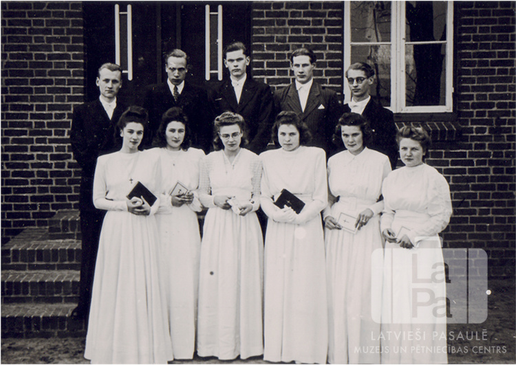 Saules ģimnāzijas 5. klases audzēkņi/ iesvētītie evaņģēliski luteriskajā baznīcā Saules nometnē Gēsthahtā (angļu zonā). Sešas meitenes ir ģērbušās baltās kleitās, pieci puiši uzvalkos. Visi stāv pie ķieģeļu ēkas kāpnēm. Pirmajā rindā, no kreisās: Dzidra Tiltiņa, Ilga Eglīte, Margarita Zommere, Astrīde Knēzs - Knezinska, Biruta Aplociņa, Rita Budule. Otrajā rindā, no kreisās: Olģerts Tamužs, Andrejs Tomass, Uģis Upītis, Ēvalds Viškers, Gunārs Čukurs."