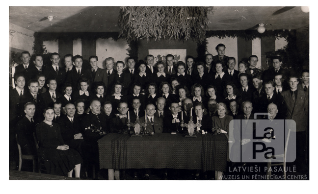 Liela skolēnu un skolotāju grupa Saules ģimnāzijas 3. izlaidumā Saules nometnē Gēsthahtā (angļu zonā). Visi cilvēki ir ģērbušies svinīgos tērpos – uzvalkos un kleitās. Priekšā ir novietots galds ar rakstainu galdautu, uz kura ir divi lieli svečturi, katrā pa trim svecēm. Telpas vidū no griestiem nokarājas skujkoku zari. Aizmugurē, pie telpas sienas, ir divi Latvijas karogi un sienas vidū – Latvijas ģerbonis. Arī gala siena ir izdekorēta ar skujkoku zariem. Par šo gadījumu Gunārs Čukurs atceras: "Pēc ģimnāzijas beigšanas vairāki skolnieki sāka studēt Baltijas Universitātē un citur Vācijā. Es izšķīros apmeklēt Latviešu tehnikumu Verdenē."