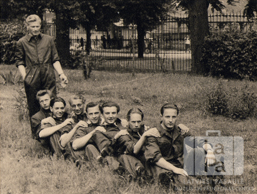 Astoņi puiši – studenti – latviešu tehnikumā Fērdenē (angļu zonā). Septiņi puiši sēž zālē rindā viens aiz otra, astotais stāv aiz viņiem. Fonā koki, dzīvžogs un metāla žogs, aiz kura pa ielu pastaigājas cilvēki. No kreisās: ? Eglītis, L. Leitis, Dz. Gobiņš, Gunārs Čukurs, I. Mancs, A. Vilkens, G. Linde, nezināms.