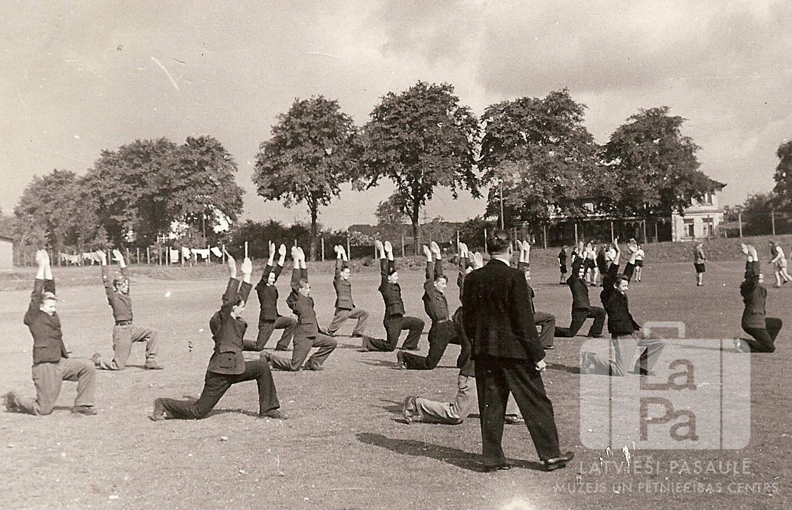 Kārļa Skalbes latviešu ģimnāzijas skolēni vingro laukumā vingrošanas stundas laikā Antverpes nometnē Flensburgā (angļu zonā). Visiem vīriešiem ir uz augšu izstieptas rokas. Priekšplānā pastaigājas vīrietis uzvalkā. Fonā, labajā pusē, uz laukuma redzamas jaunietes. Fonā ir koku rinda, aiz tās – divstāvu ēka.