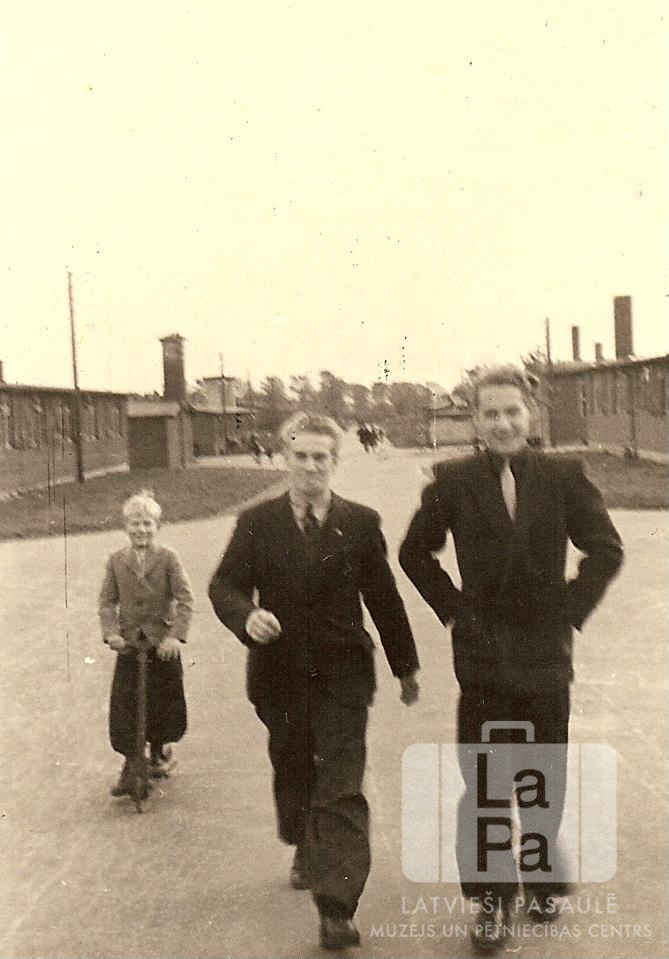 Divi jaunieši no Kārļa Skalbes ģimnāzijas Antverpes nometnē Flensburgā (angļu zonā) soļo pa nometnes ielu. Abi valkā tumšus uzvalkus un spīdīgas kurpes. Aiz viņiem uz skrejriteņa stāv mazs zēns. Fonā abās ielas pusēs ir vienstāvu koka barakas.