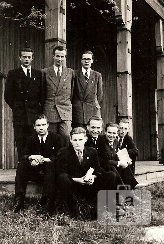Pinnebergas ģimnāzijas (angļu zonā) 5. klases audzēkņi – jauni vīrieši – pie koka ēkas koka kolonnām. Visi ir ģērbušies uzvalkos. Aizmugurē, otrais no kreisās: Uldis Inveiss.