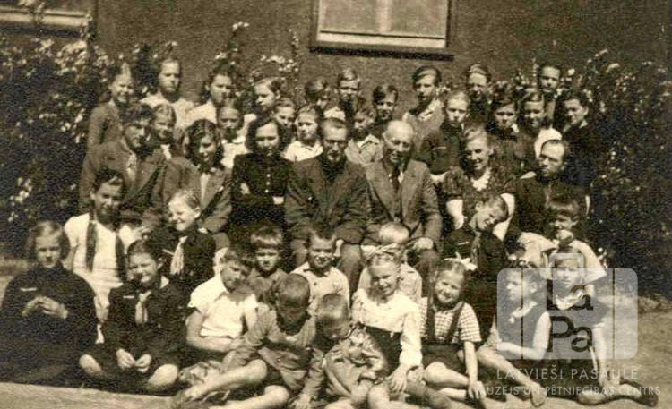 Latviešu tautskolas skolēni un skolotāji pie ēkas Braunšveigas nometnē (angļu zonā). Pirmajā rindā, vidū, no kreisās: Jānis Vaseris un Valdis Goba. Otrajā rindā, no kreisās: Inta Miķelsone, Larisa Rozentāle, Aivars Siliņš, Edvīns Zariņš, Edgars Inapšs, Ieva Dūna, Dace Kica, Vilhelmīne Karpa un Aina Šterna. Trešajā rindā, no kreisās: Lilija Untule, Ligita Birzgale, Indris Eidemanis, Margarieta Karpa un Valdis Zariņš. Ceturtajā rindā sēž, no kreisās: Antons Munčs (skolotājs), Rasma Kica (skolas sekretāre), Marta Tauriņa (skolotāja), Artūrs Cipulis (pārzinis), ? Ozoliņš (inspektors), Alvine Eidemane (skolotāja) un Pēteris Salmiņš (skolotājs). Piektajā rindā, no kreisās: Dzidra Zariņa, Skaidrīte Zirnīte, Leons Kalnājs, Dzintars Sproģis, Olģerts Mikelāns, Gundārs Grīslītis, Tālrīts Priedītis, Aina Oše un Ligita Sproģe. Pēdējā rindā, no kreisās: Astrīda Voicechovska, Aina Miķelsone, Larisa Pokļikājeva, Inta Birzgale, Vilis Kažotnieks, Oskars Inapšs, Hatijs Kunce, Gunārs Šukurs, Paulis Inapšs un Harietta Kunce.