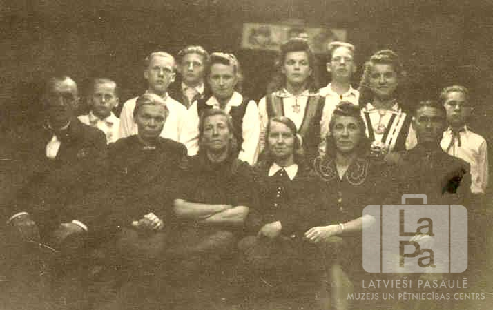 Braunšveigas nometnes (angļu zonā) latviešu tautskolas 2. mācību gada absolventi tautastērpos ar vecākiem. Otrajā rindā, no kreisās: Dzintars Sproģis, Gundārs Grīslītis, Gunārs Šukurs, Aina Oše, Hariette Kunce, Paulis Inapšs, Īda Kôla un Leons Kalnājs.