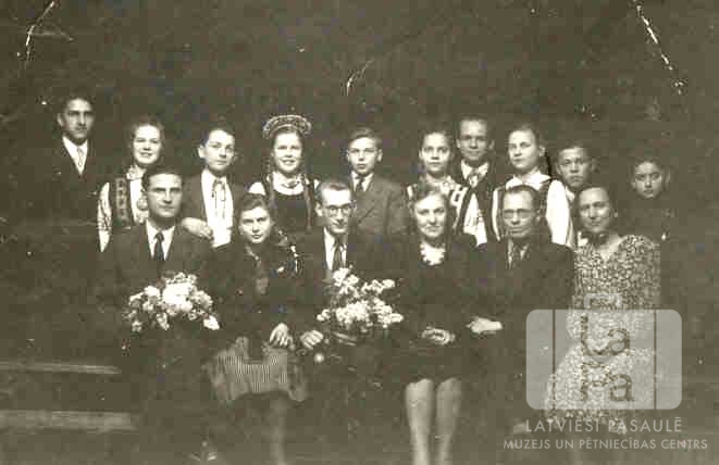 Braunšveigas nometnes (angļu zonā) latviešu tautskolas 3. mācību gada absolventi un skolotāji. Priekšā sēž skolotāji, diviem vīriešiem rokās ziedi. Aizmugurē stāv skolēni, meitenes valkā tautastērpus. Pirmajā rindā, no kreisās: Martiņš Ozoliņš (klases audzinātājs, vēlāk mācītājs), Rasma Cipule (skolas sekretāre), Artūrs Cipulis (pārzinis), Alvīne Eidemane (skolotāja), Pēteris Salmiņš (skolotājs) un Marta Tauriņa (skolotāja). Otrajā rindā, no kreisās: Harijs Zikmanis, Aina Miķelsone, Ilmārs Birznieks, Astrīda Voicechovska, Zigurds Matvejs, Inta Birzgale, Oskars Inapšs, Biruta Tauriņa, Tālrīts Priedītis un Olģerts Mikelāns.