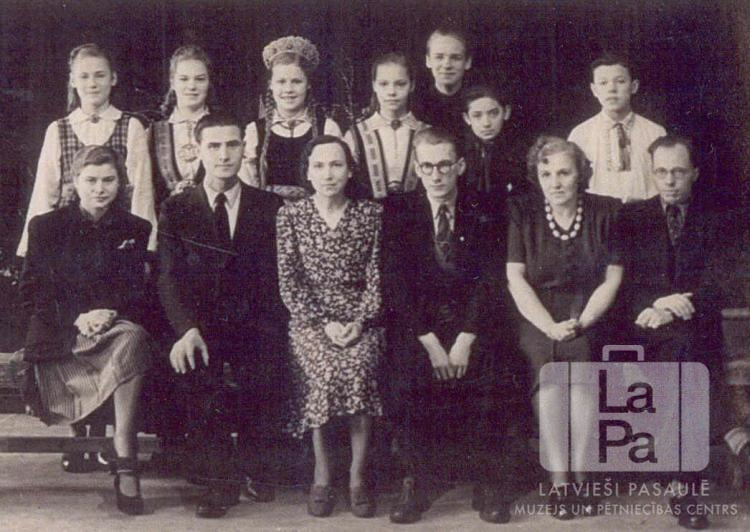 Braunšveigas nometnes (angļu zonā) latviešu tautskolas 3. mācību gada absolventi ar pieaugušajiem. Jaunieši stāv aizmugurē, meitenes ir ģērbušās tautastērpos.