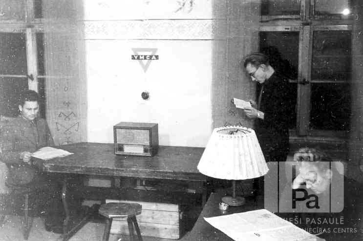 Trīs cilvēki lasa grāmatas/ avīzes lasītavā Braunšveigas nometnē (angļu zonā). Divi cilvēki sēž pie galda, viens vīrietis stāv kājās. Uz viena galda ir radio aparāts, virs tā uz sienas otrādi apgriezts trīsstūrīs (ar spici uz leju) un burti "YMCA". No kreisās: otrais Artūrs Cipulis un trešā Alvīne Eidemane.