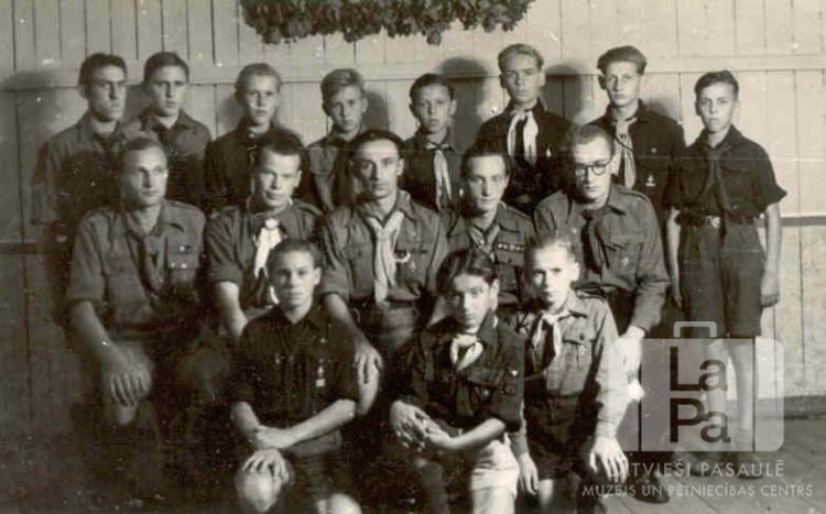 Liela skautu grupa Straumēnu nometnē Hallendorfā (angļu zonā) 1947. gada rudenī Braunšveigas nometnes Valmieras 47. skautu vienības skautu pulka apciemojuma laikā. Grupā ir gan Valmieras 47. vienības skauti, gan arī Gaŗezera 89. jūras skautu vienība no Straumēnu nometnes.