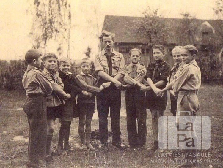 Valmieras 47. skautu vienības mazskautu pulks ar vadītāju Braunšveigas nometnē (angļu zonā). Visi valkā skautu formastērpus un stāv viens otram blakus pusaplī, krusteniski paspiestām rokām. Fonā, labajā pusē, ir ēka. No kreisās: Ivars Elksnis, Aivars Zariņš, Māris Birzgalis, Valdis Goba, Akselis Mangulis (vadītājs), Edvīns Zariņš, Aivars Siliņš, Indris Eidemanis un Valdis Zariņš.