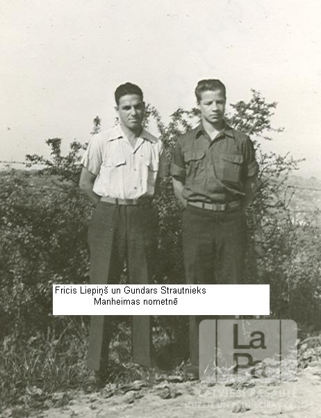 Divi draugi no Manheimas nometnes (angļu zonā) stāv pie krūmāja 1949. gada vasarā. No kreisās: Fricis Liepiņš un Gundars Strautnieks. Par šo gadījumu Gundars Strautnieks atceras: "Mēs uzaugām, dzīvodami četrus gadus DP nometnēs."