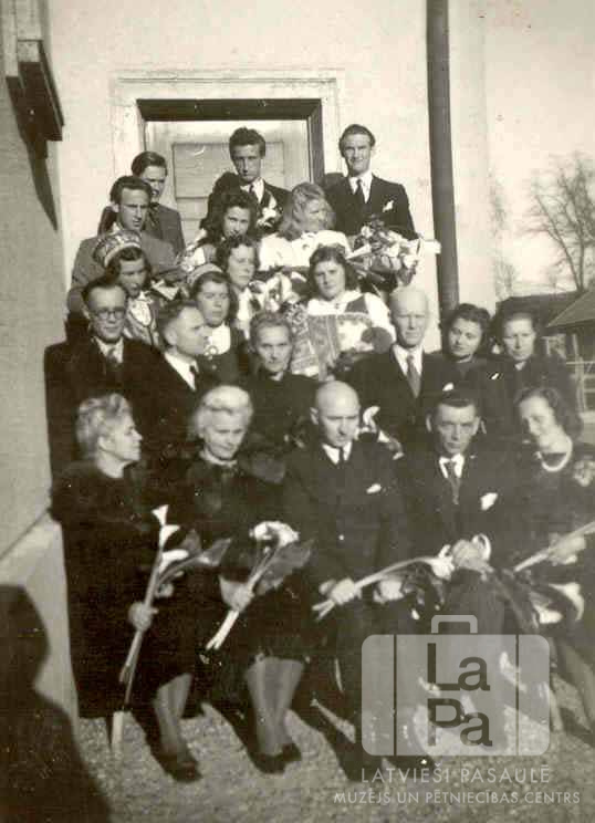 Absolventi un skolotāji ģimnāzijas izlaidumā Neietingas nometnē (amerikāņu zonā). Visi ir ģērbušies svinīgās drēbēs. Vairākiem cilvēkiem rokās ir puķes. Pirmajā rindā, trešais no kreisās: Leonards Latkovskis (ģimnāzijas direktors).