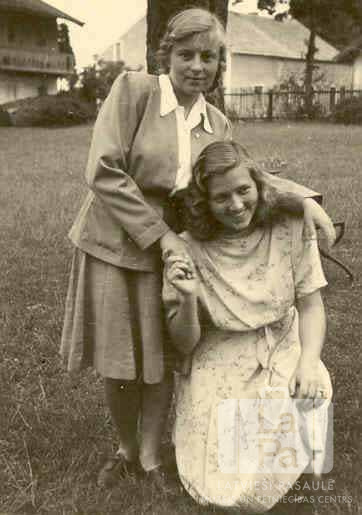 Divas jaunietes Neietingā (amerikāņu zonā). Fonā redzamas nometnes ēkas. No kreisās: Renāte Avotiņa un Dzidra Galiņa.