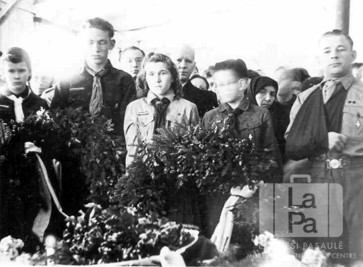 Jaunieši formastērpos stāv pie zārka Pededzes 65. skautu vienības skauta Viļņa Vikmaņa bērēs Mīldorfas nometnē (amerikāņu zonā). Priekšā, no kreisās: Gunta Cīrule (pr. Grīsle), Edvīns Rasums, Biruta Segliņa, Viesturs Zommers un Osvalds Kļavenieks (vadītājs).