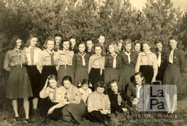Saules 72. gaidu vienības gaidas formastērpos Erlangenē (amerikāņu zonā) 1949. gada vasarā. Fonā egļu jaunaudze. Pirmā no labās: Nora Šteinharde (vadītāja).