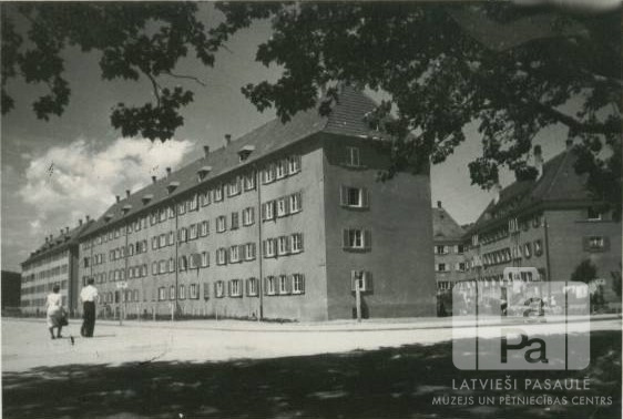 Četru stāvu bloku ēkas Eslingenē (amerikāņu zonā). Priekšplānā pāri ielai dodas vīrietis un sieviete.