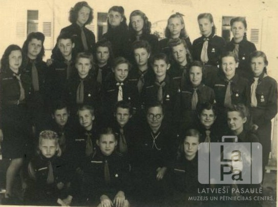 Latviešu Viesītes 49. gaidu vienības meitenes formastērpos Eslingenē (amerikāņu zonā). Otrajā rindā, ceturtā no kreisās: Marija Saliņa (gaidu vienības vadītāja).