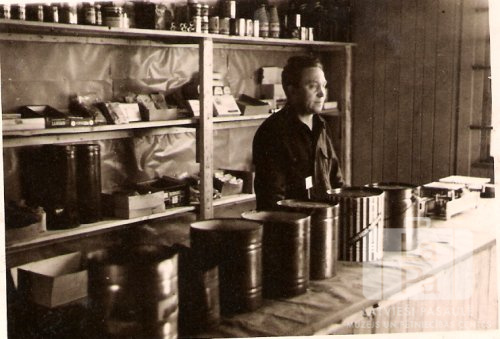 Jānis Pūriņš aiz koka letes savā veikalā Valkas nometnē Nirnbergā (amerikāņu zonā). Uz letes stāv vairākas metāla bundžas. Uz aizmugurējās sienas koka plaukti ar dažādām precēm.