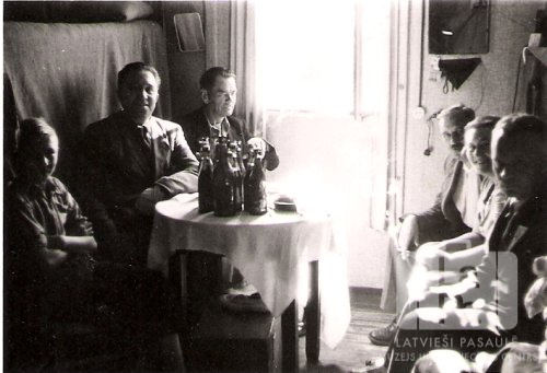 Seši cilvēki sēž istabā Pūriņu dzīvoklī, Valkas nometnē Nirnbergā (amerikāņu zonā). Telpas vidū neliels, apaļš galds ar baltu galdautu; uz tā vairākas pudeles. Telpas aizmugurē logs. No kreisās: pirmais Guntis Pūriņš, otrais Jānis Pūriņš, piektā Emma Pūriņš.