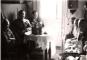 Seši cilvēki sēž istabā, aizmugures sienā logs, vidū mazs apaļš galdiņš apklāts ar baltu galdautu, uz galda pudeles