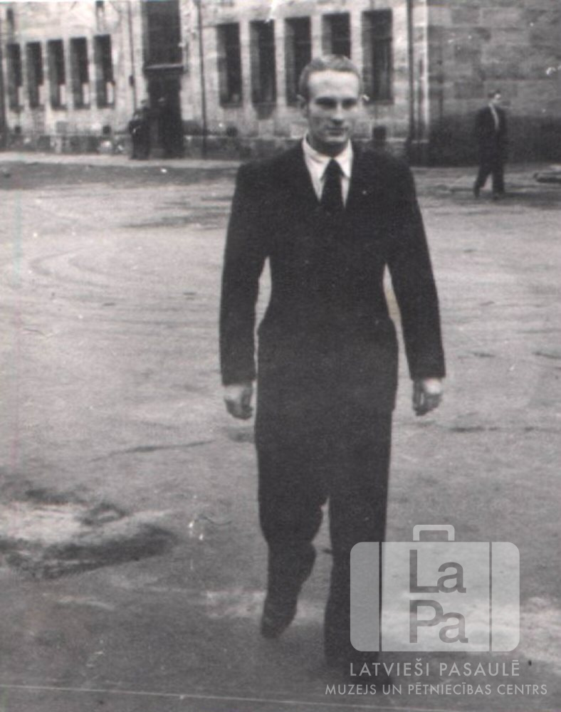 Harijs Saukants uzvalkā pastaigājas pa Firtes nometnes (amerikāņu zonā) blokmāju pagalmu. Fonā redzama mūra ēka.