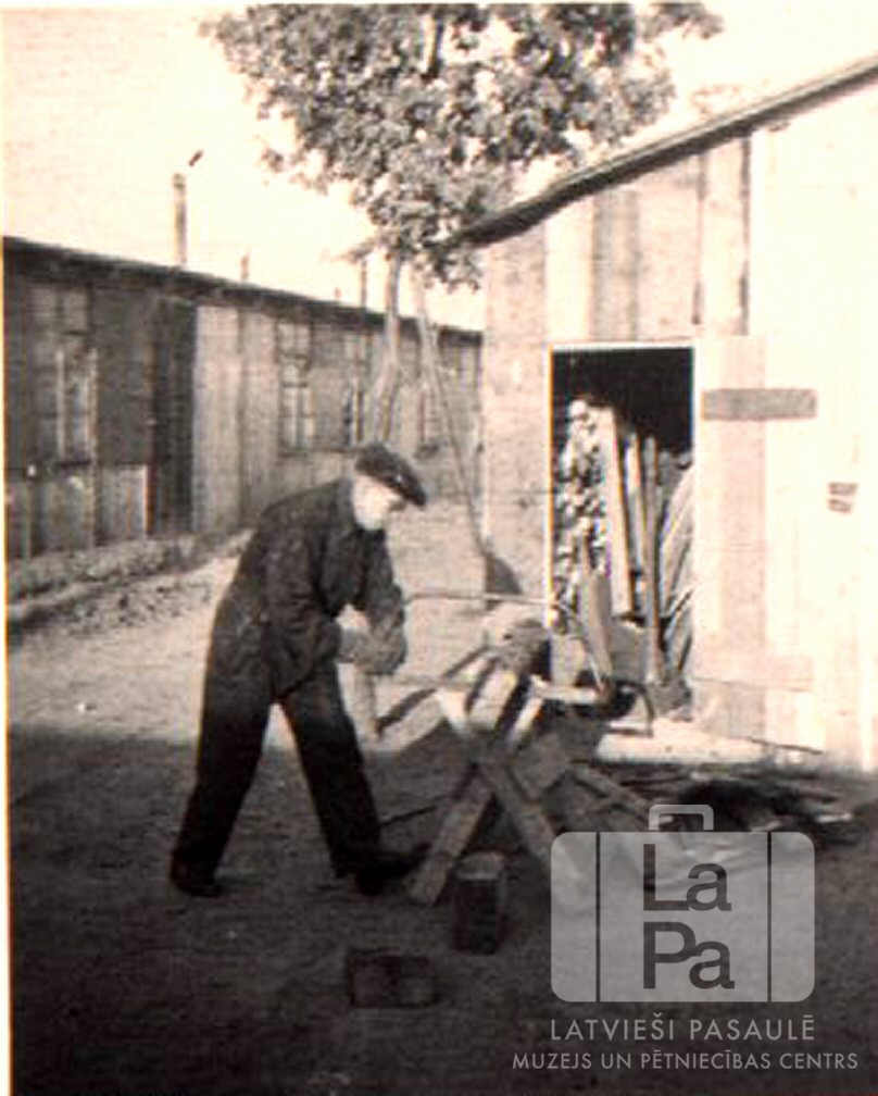 Jānis Saukants zāģē malku pie vienstāvu barakām Mercfeldas nometnē (amerikāņu zonā).