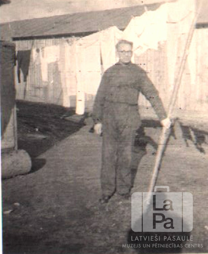 Jānis Saukants stāv pie žāvēšanai izliktas veļas Mercfeldas nometnē (amerikāņu zonā). Aizmugurē vienstāvu koka baraka. Priekšplānā uz zemes ir redzama fotogrāfa ēna.