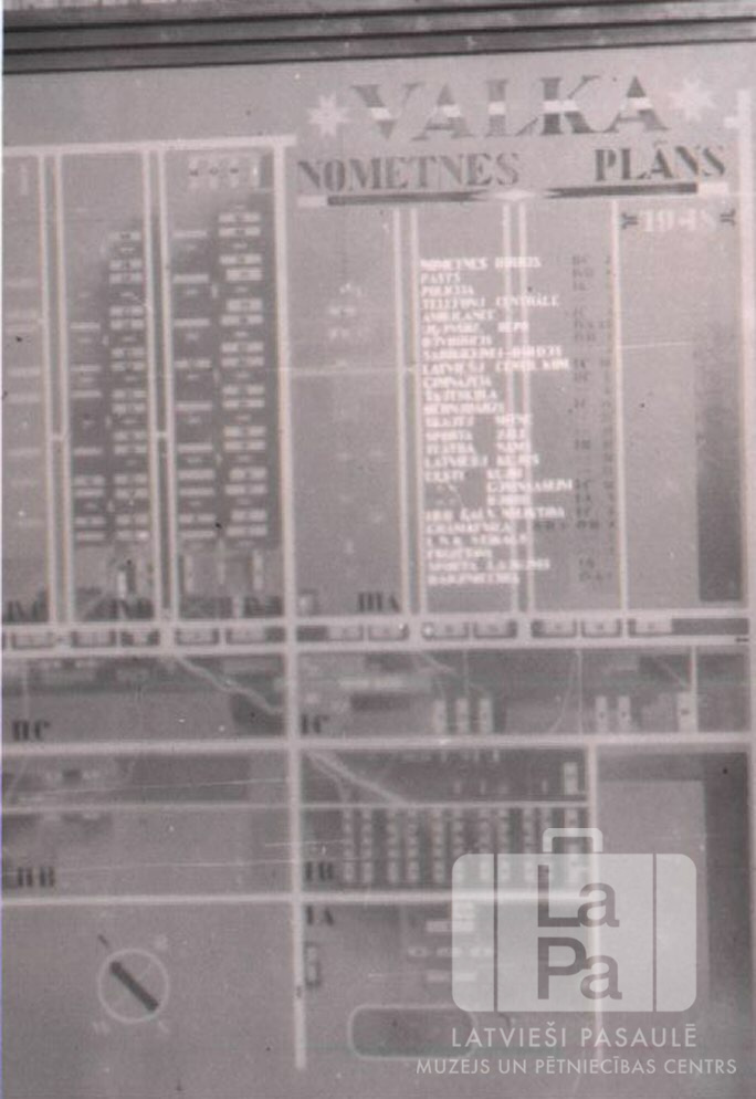 Valkas nometnes plāns Nirnbergā (amerikāņu zonā). Uz plāna ir vārdi "VALKA / NOMETNES PLĀNS". Redzama rinda ar neskaidriem vārdiem.