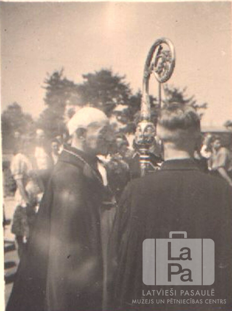 Divi garīdznieki arhibīskapa vizītes laikā Valkas nometnē Nirnbergā (amerikāņu zonā). Vinam rokās ir scepteris. Fonā cilvēku grupa. Priekšplānā, no kreisās: Teodors Grīnbergs (arhibīskaps), ? Turks (mācītājs).