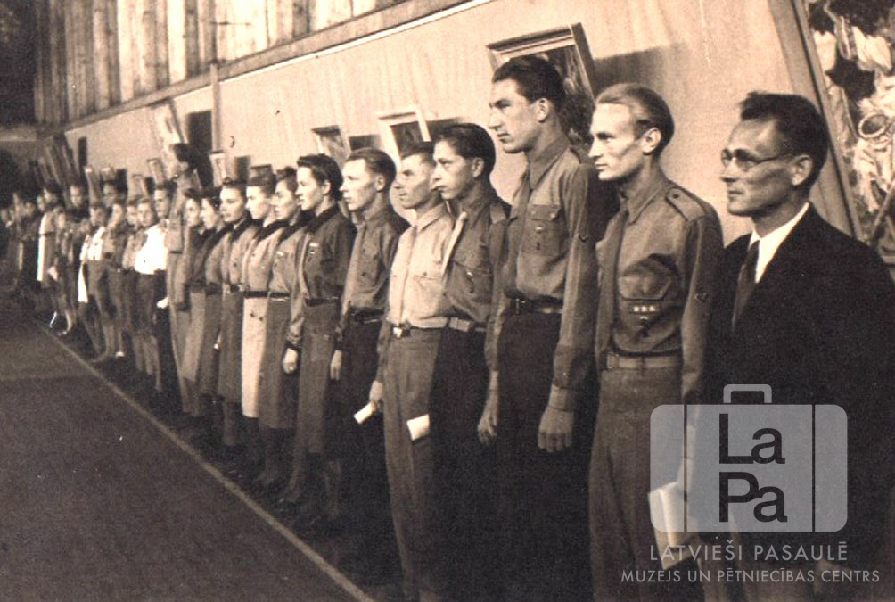 Mazpulka vienības bērni un jaunieši formastērpos stāv goda sardzē tēlotājmākslas izstādes atklāšanas laikā Valkas nometnē Nirnbergā (amerikāņu zonā). Fonā pie sienas ir gleznas. No labās: pirmais A. Balks, (mazpulka vadītājs), otrais H. Saukants (mazpulka priekšnieks).